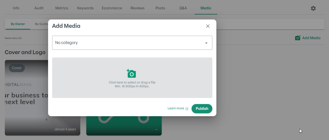- Select the Photo Category. From your device, select the image you want to upload on the Platform. Once done, click Publish.